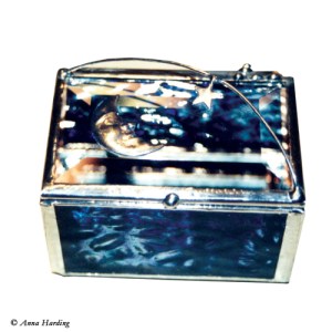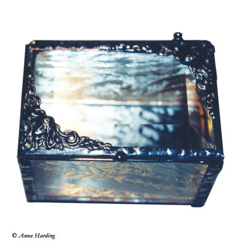 These are some of my little stained glass boxes. I make them with different tops – some I call “jewel top”, some “shell top” and others have pressed flowers or cast or stamped charms . They are 2″ x 3″ and are a great size for a hostess gift or birthday present. Most people tell me they use them as a ring box on their dresser or bathroom vanity.