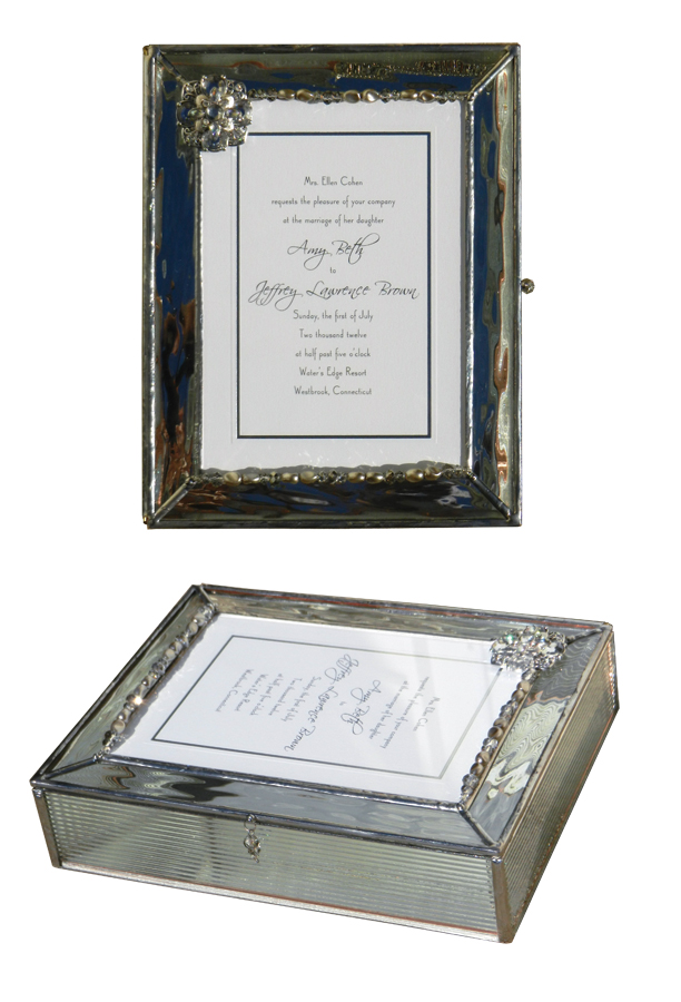 A lot of people think of stained glass as being old fashioned or cute. I think that stained glass CAN have a contemporary look to it. Made with clean lines, minimal colors and less “fluff” (which I happen to like at times!), stained glass can have a modern feel. I’ve done these three boxes with clear or ivory glass, crystals and pearls. Elegant but not stuffy!