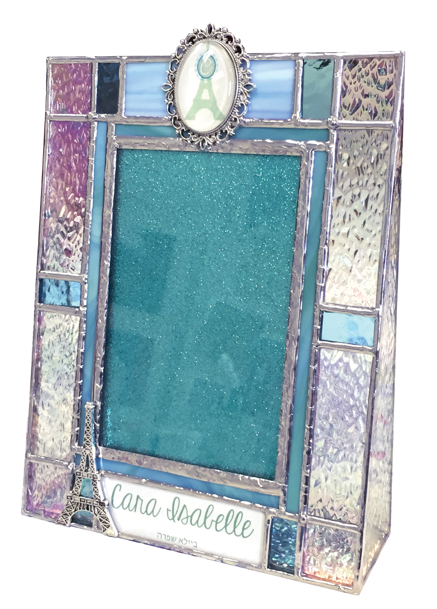 Here’s a stained glass Bat Mitzvah invitation box with a matching photo frame. I was originally asked by one person to make the box, then a few weeks later another customer asked for a box – for the same girl! So I suggested the photo frame. I don’t make them too often because they’re just as much work as the box (maybe more!) and so little of the actual invitation remains. But in cases like this, I think it works great. I did ask my first customer if she was okay with it before I proceeded as I didn’t want her to feel like her gift was lessened in any way. The second customer okayed it with the girl’s mom so we were good to go.