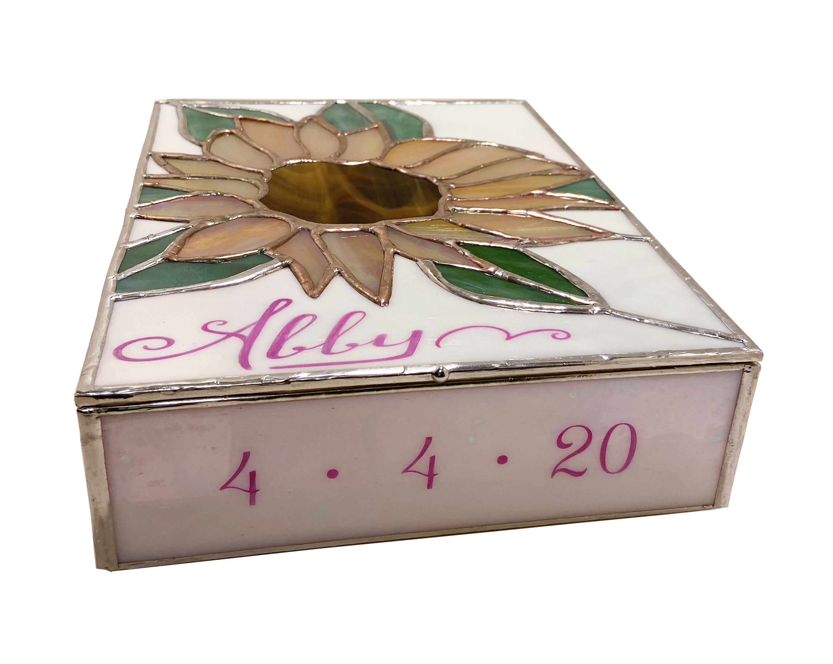 Enough about all that, though. I’ve been in my studio designing up new things. One of which is sandblasting! I design in Illustrator, cut the image in vinyl with my Cricut, then place that onto the glass. Then it’s sandblasting with a 220 carbide grit. The fun part it peeling away the vinyl to see the image in glass! Then I break out my paints or alcohol inks and dye it so it’s extra special. That’s how I did the words, ABBY and the date, above.