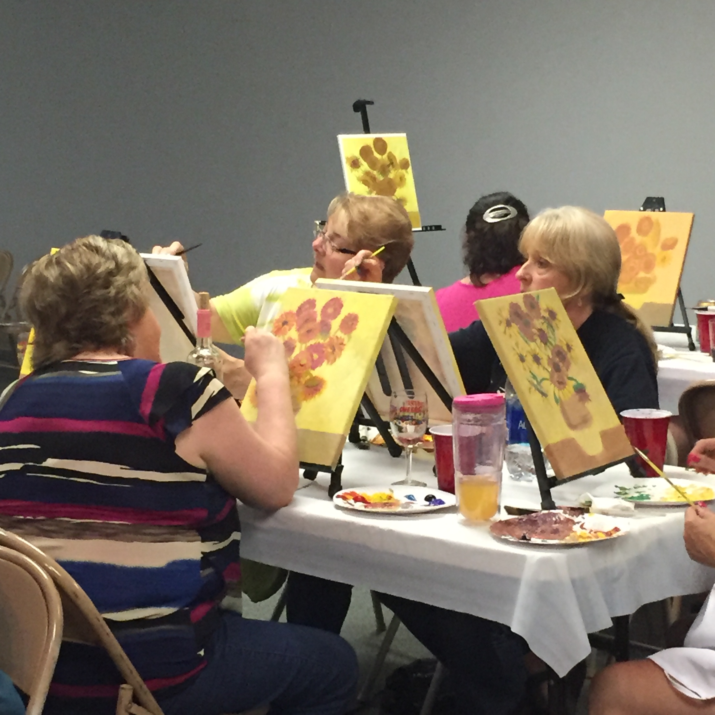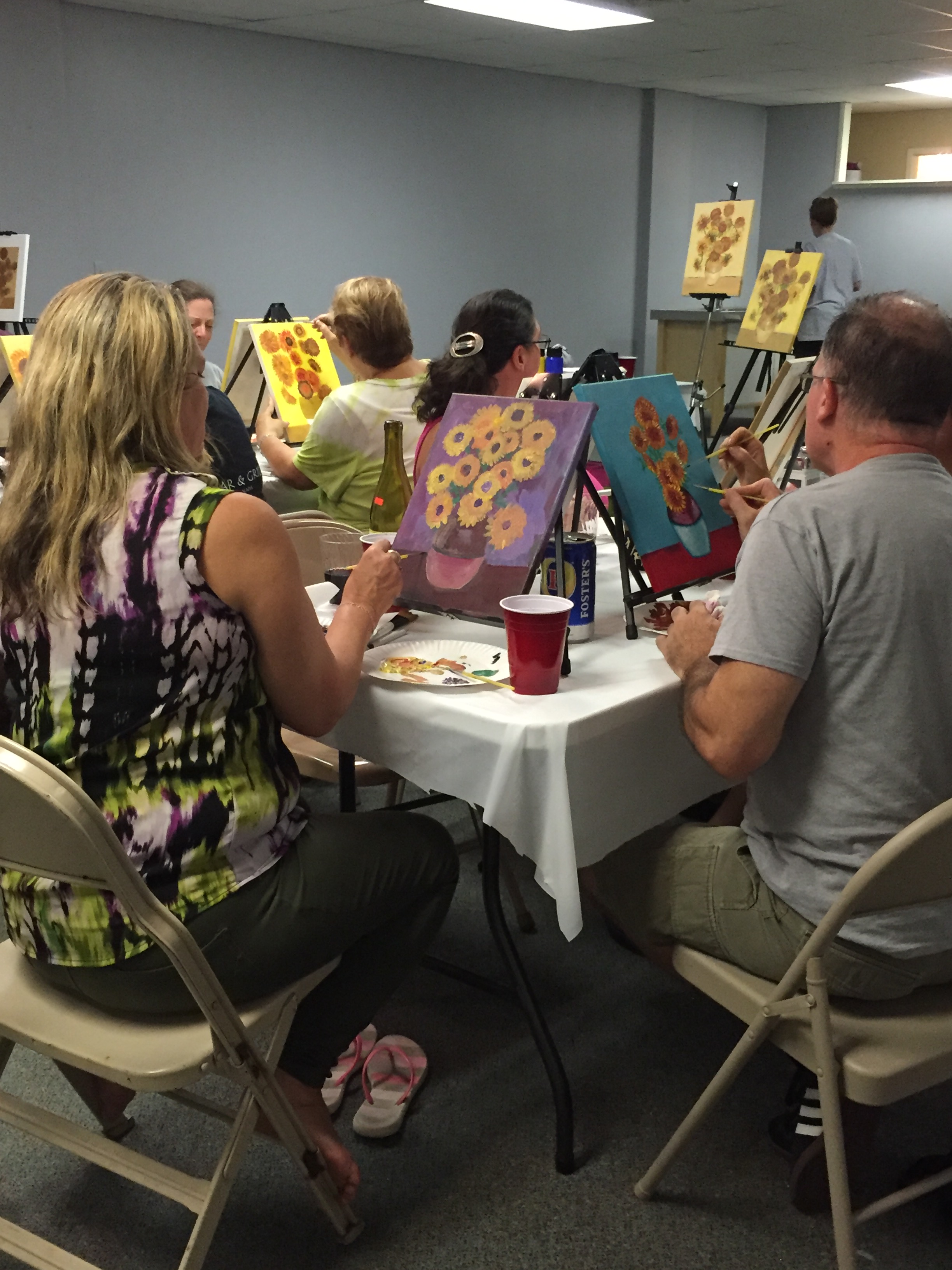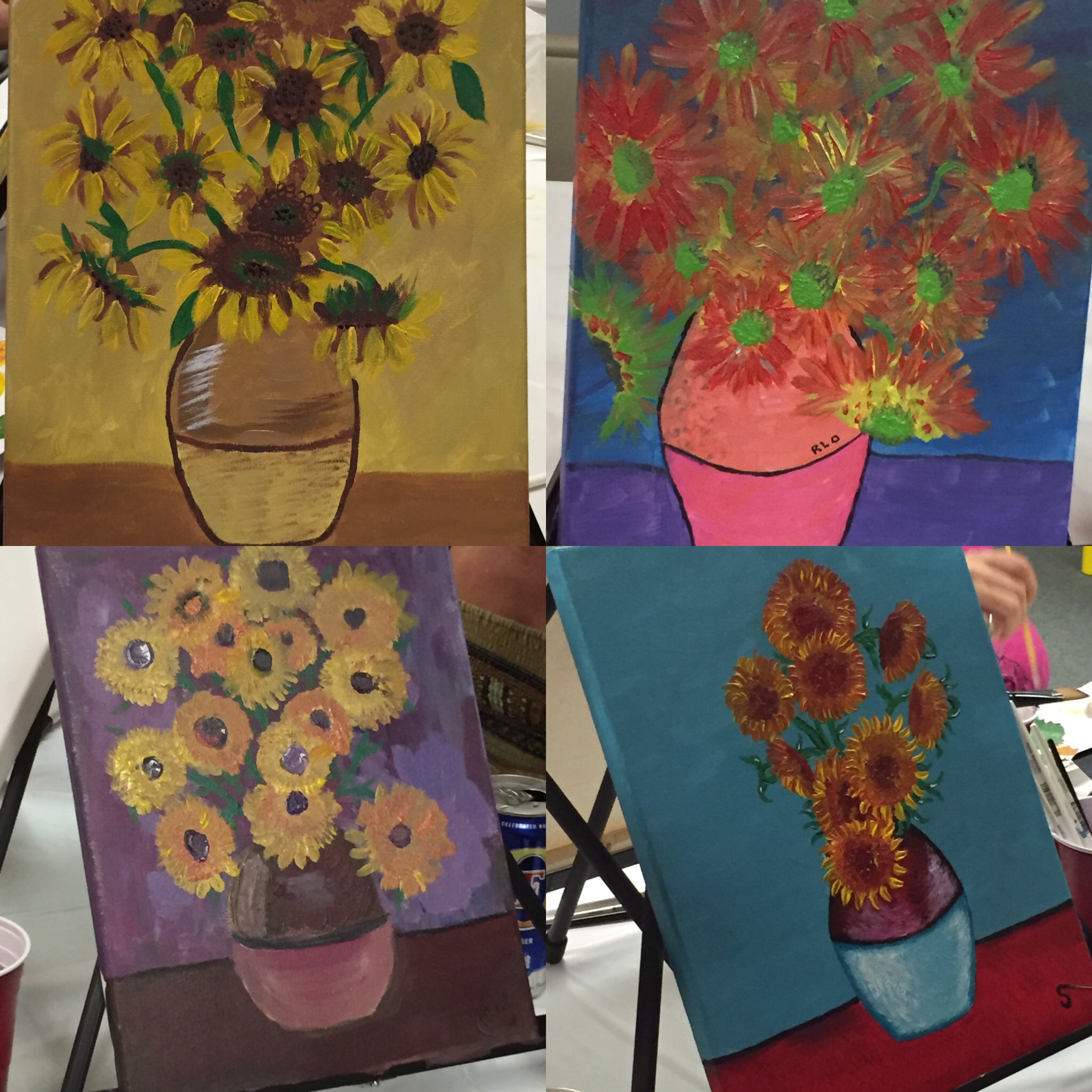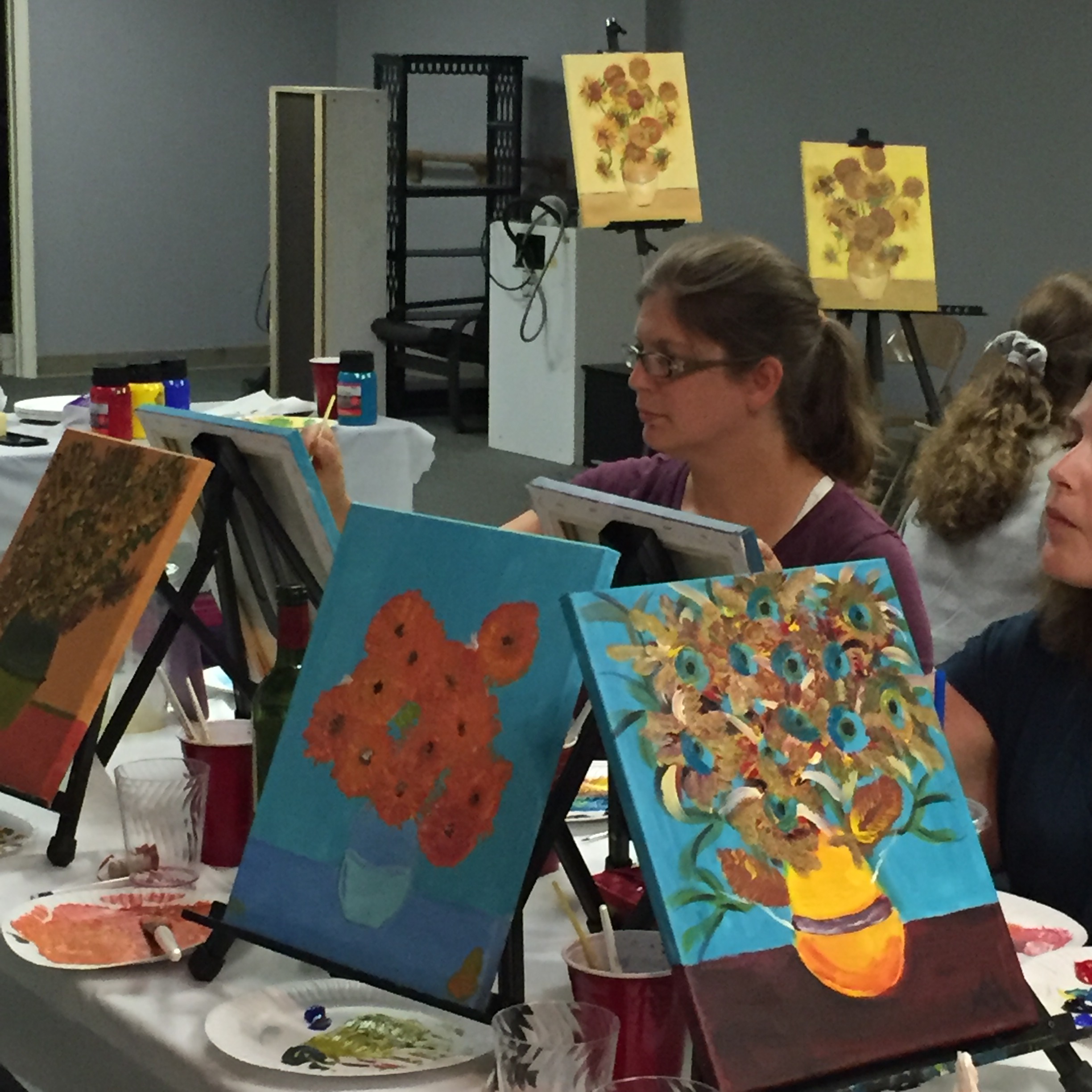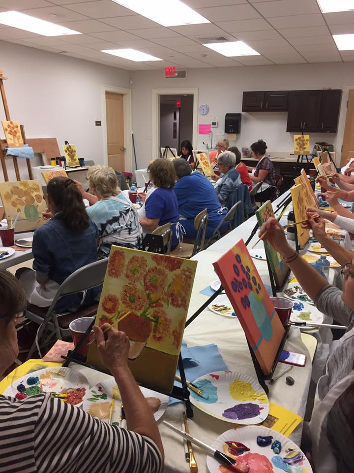 Art Nites: Big News! I’ve finally decided to dive in and teach online classes! The first one will be on Zoom, October 14th, for subscribers of the Ashford Arts Council. More details will be coming soon on the AAC website and their FB page. We’ll be starting off with Van Gogh’s Sunflowers. But not to worry; even beginners can make this turn out awesome as I’ll teach it step-by-step. See pics from in-person classes!